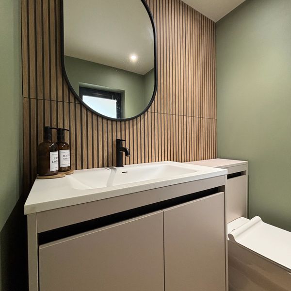 Modern cloakroom makeover featuring fluted tiled panels, sleek cabinetry and bold black fixtures.