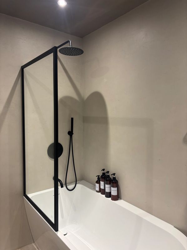 cosy contemporary bathroom finshed in micro cement walls black accents fittings with free standing bath