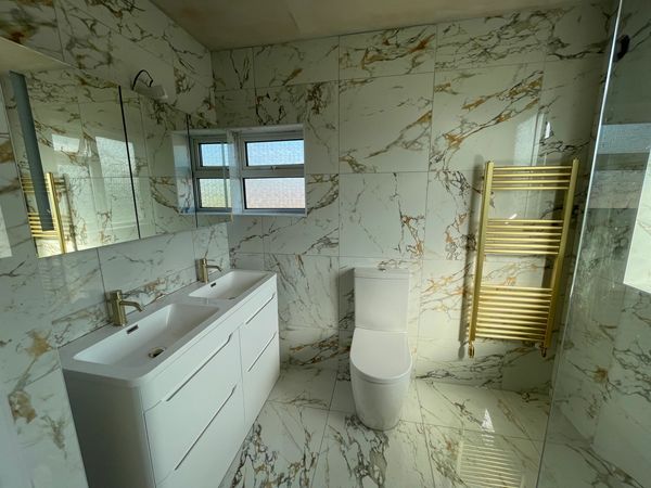 Luxurious marble-effect bathroom with sleek, modern fittings and warm golden accents.