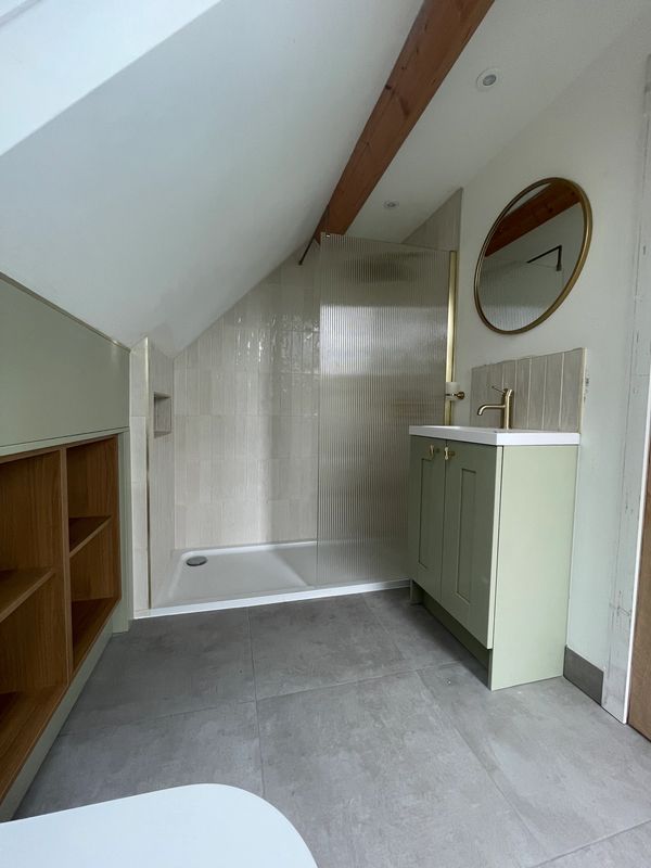 Stylish loft bathroom with bespoke cabinetry, walk-in shower and brass finishes.